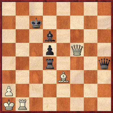 41...Be7! 42.Rc1+ Теперь 42.a3 Rc4 приводит только к вечному шаху после 43.Qxd5 (43.Bb6+? Kd6, и тут уже белые рискуют проиграть) 43...Bf6+ 44.Ka2 Qh2+ 45.Bd2 Rc2+ 46.Kb3 Qxd2 47.Qf7+; есть подозрение, что ход 42.Rc1+ был записанным, и дома соперники убедились, что 42...Kd6! спасает (за доской была бы еще надежда на 42...Rc4? 43.Bf4+!) 1/2