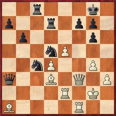 22...c5 23.Nb3 Kg7 24.Kd1 Qxa8 25.Nxc5 Qc6 26.Nd3 Re8 "На 26...Bc3 27.Qe2 Re8 белые собирались играть 28.Qg4".