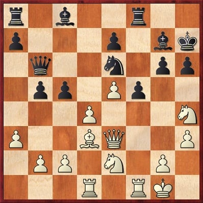 17...g5 18.Nf6+ exf6 19.Bxf6+ Be7 20.Bxe7 Сразу форсировало победу 20.d6! cxd6 (очевидно, вынужденно) 21.Bxe7 (или 21.Rxe7+ Kf8 22.Re8+) 21...Qa8 (21...Qxe7 22.Qc8#) 22.Bf6+ Kf8 23.Qxd6#