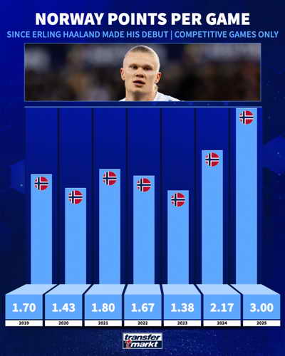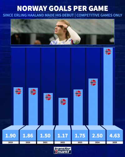Ниже - статистика от Transfermarkt, которая показывает, как резко рванула вверх результативность сборной Норвегии за последние два года, когда команда Сольбаккена окончательно "устаканилась". В 2024 она забивала в среднем по 2.5 гола за матч - больше, чем за многие годы. Это был очень серьезный показатель. Но оказалось, что можно еще лучше, причем - намного лучше. В 2025 средняя результативность Норвегии достигла просто сумасшедшей отметки - 4.63.
