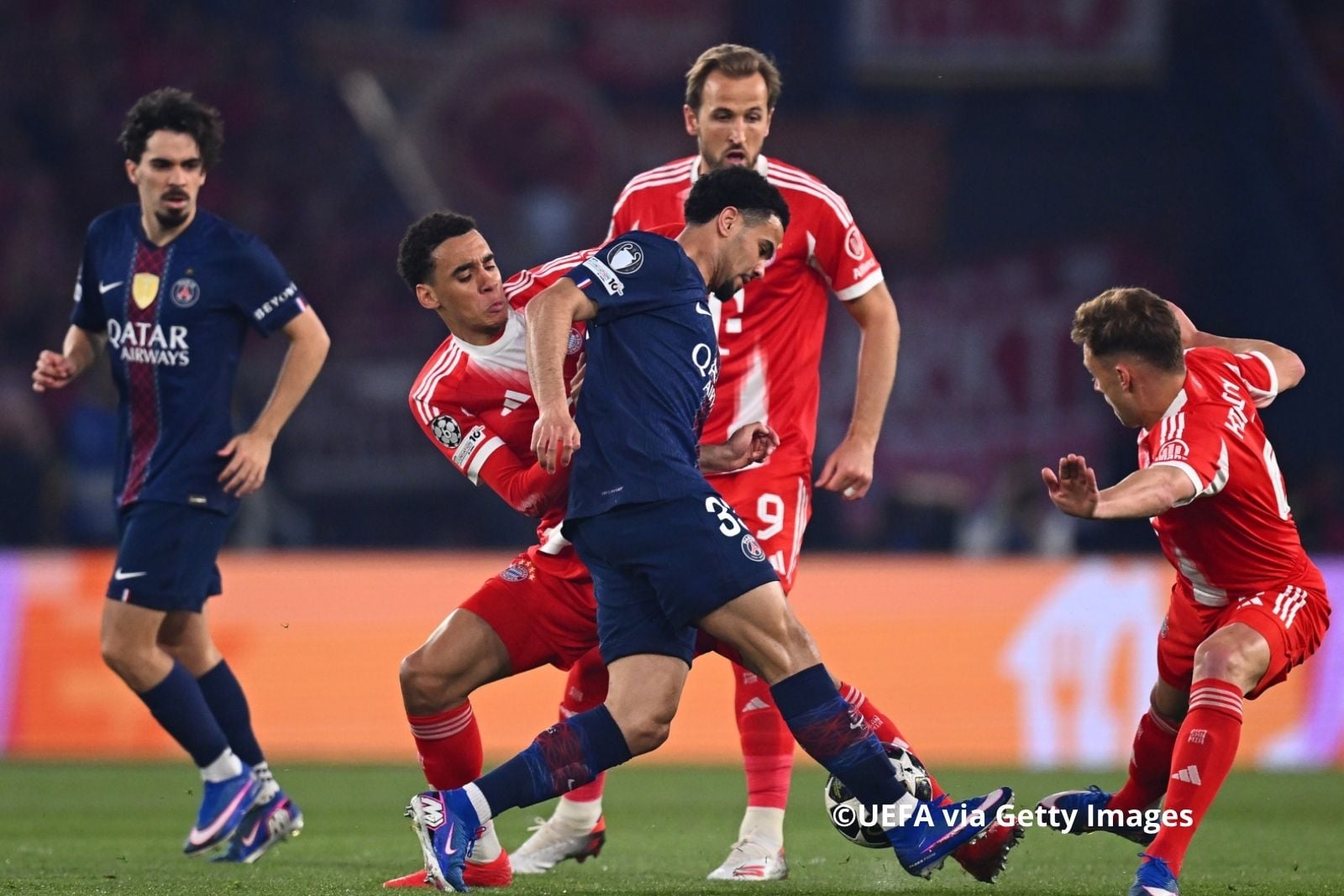 Голы: Кейн Г., 17 (пенальти) (0:1); Кварацхелия, 24 (1:1); Невеш Ж.П., 33 (2:1); Олисе, 41 (2:2); Дембеле У., 45 (пенальти) (3:2); Кварацхелия, 56 (4:2); Дембеле У., 59 (5:2); Упамекано, 65 (5:3); Диас Л., 68 (5:4)